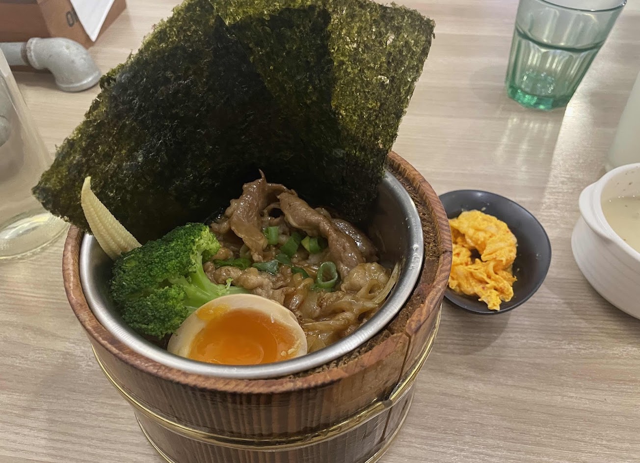 丼飯很可愛用飯桶裝,老闆特別強調用海苔包飯跟泡菜大口享用很美味。