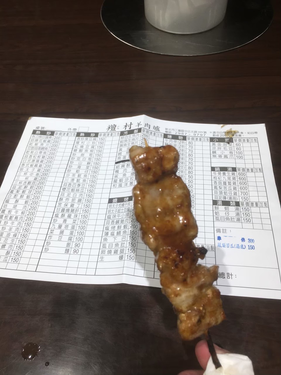 一份羊肉爐320元,湯頭不錯滿香的,羊肉塊不會很腥,不太吃羊的老公都吃的津津有味,單點沒有羊肉塊的選擇,只有羊肉片;有熱炒類,點了鹹酥杏鮑菇.蚵仔酥.炸豆腐,都滿不錯的,炸薯條份量不少,不是乾乾扁扁的那種,好吃;也有燒烤類,甜不辣滿不錯的,2串50元,一串有2片,醬料味道鹹甜;烤雞皮是屬於很乾像餅乾的那種,較不是我的菜,但也許有的人是喜歡這種口感啦;室內外都有位置,我們坐戶外有人會抽煙我較不喜歡;沒有限時不能訂位,要就早點來唷~工作人員態度都滿好的,很忙碌但還會走來主動加湯;這間不只是單純的羊肉爐,有熱炒有燒烤,大人小孩都很適合的用餐地方,下回會再來,推薦~~