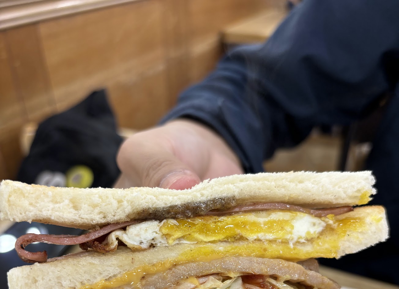 豬排總匯三明治也好吃,半熟蛋在裡面超讚