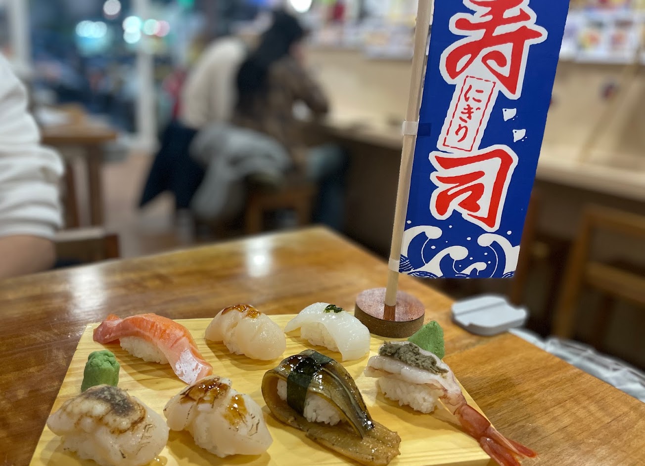 烤竹莢魚、烤鮭魚飯團、烤羊肉串