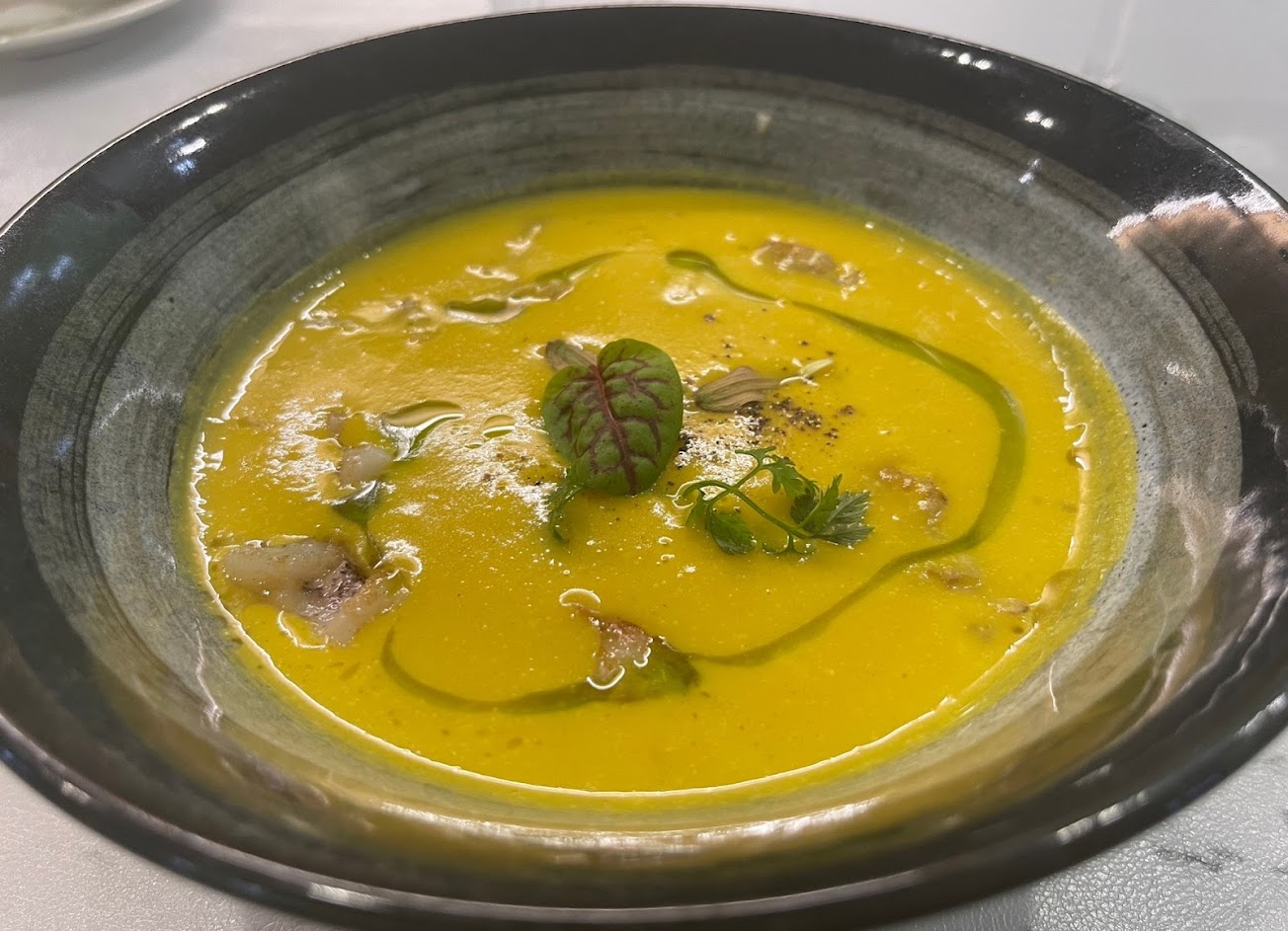前菜的松露土雞蛋口感很綿密,沒想過蛋沙拉和松露可以這樣搭配。蔬菜濃湯的味道真的很強!可以喝到蔬菜的甜味,因為湯沒有加任何奶油,所以濃郁卻不膩口?忍不住一口接著一口,所有的餐點都感受得到主廚的用心與巧思,很好奇亞洲風味菜的口味又會是如何,下次真的會想再來試看看!
