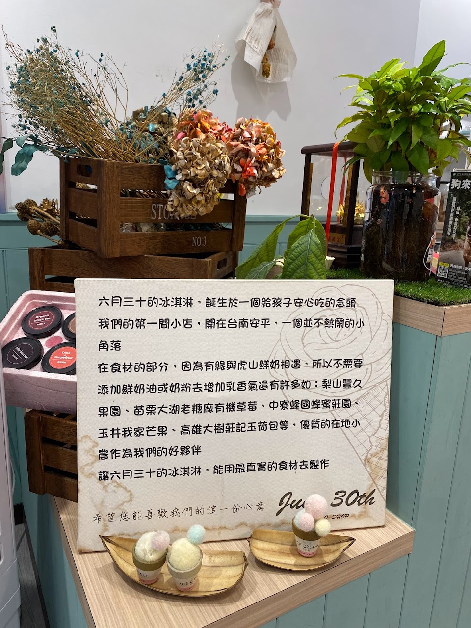 ?這次要跟大家分享的店是從台南開上來台北的冰淇淋,除了造型超吸睛之外,聽說店名也是藏有小故事的,六月三十是老闆兒子的生日,好有紀念價值的一家店!使用的材料也都是經過老闆層層把關,讓寶貝還有客人能吃得健康又美味~