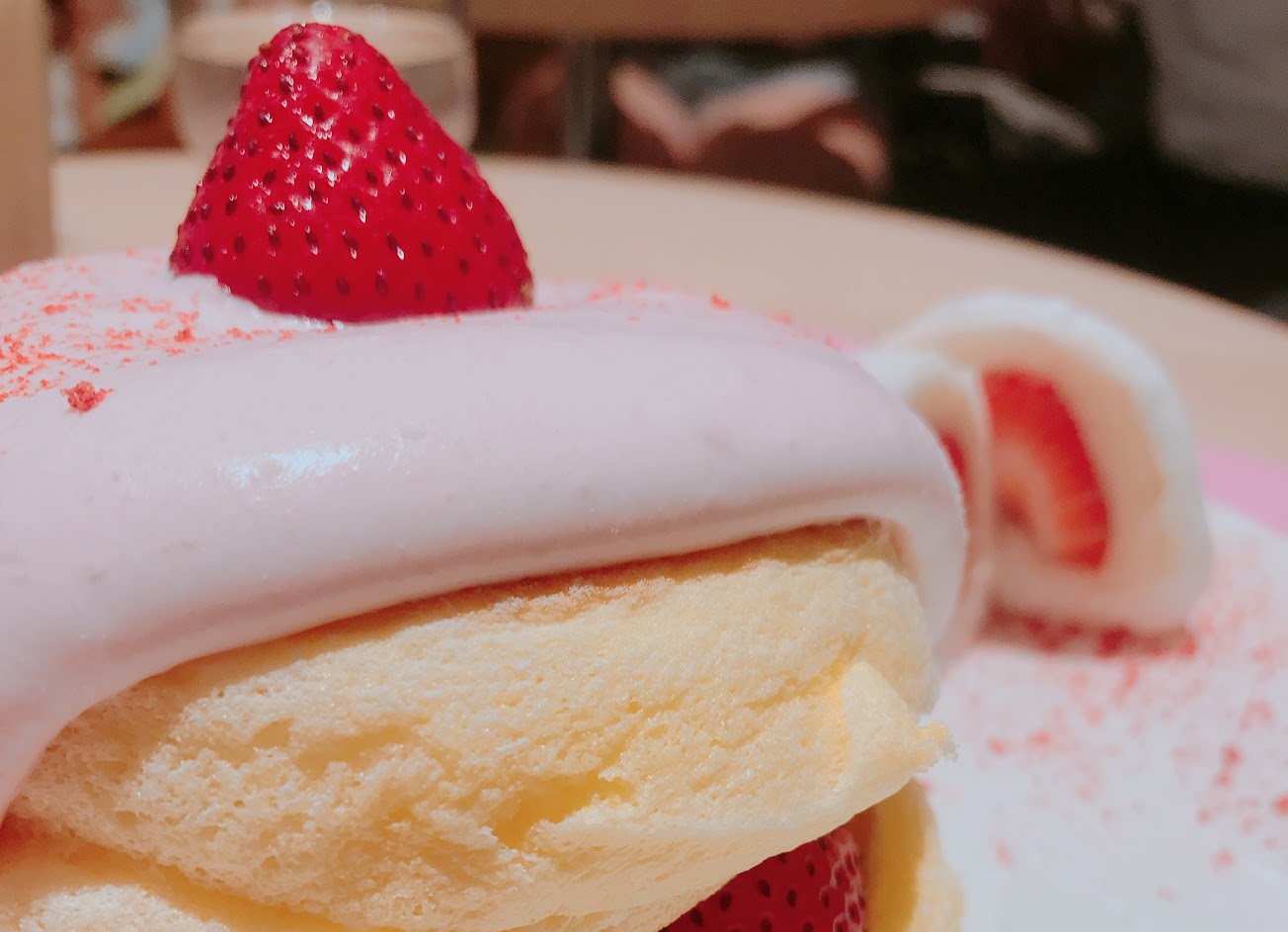 再過一個月應該就沒這麻多人排隊了,週日早上約9點到排第三位。之前百貨11點開門前到排到捷運公園旁,現在真的還好。草苺口味很清爽,鬆餅口感綿密有點像台灣古早味天使蛋糕。上面一陀奶油也不甜膩有點像慕斯口感。若不用排太久是可以偶爾來享受一下。但鬆餅現場現點現作要等15-30分鐘。