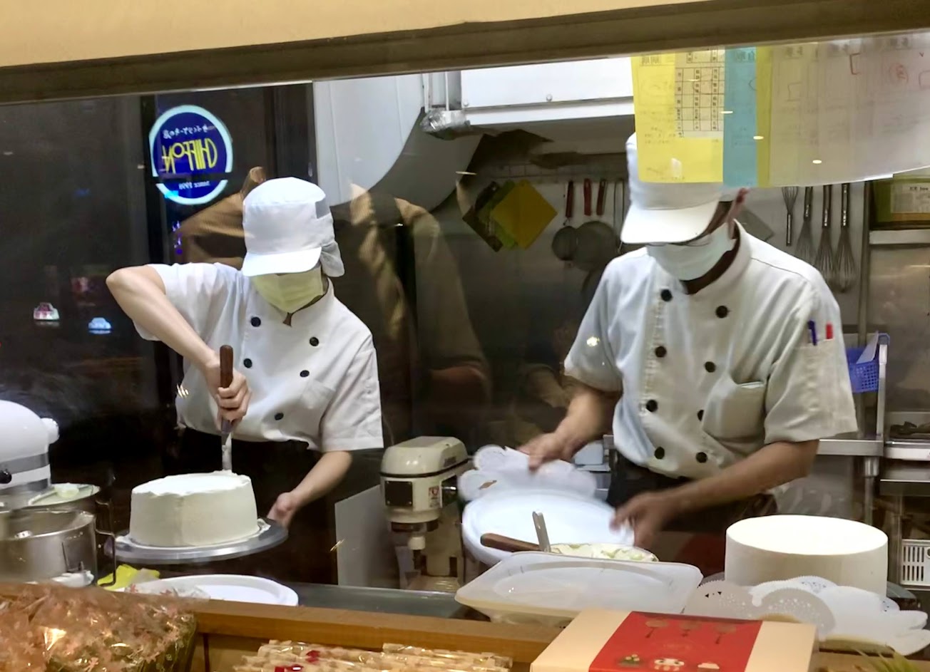 ##重點..想說欣賞一些師傅手作蛋糕,沒想到兩個做蛋糕都沒戴口罩、還在講話…7/11號下午5:40分,可以看一下監視器,人員的教育訓練要加強