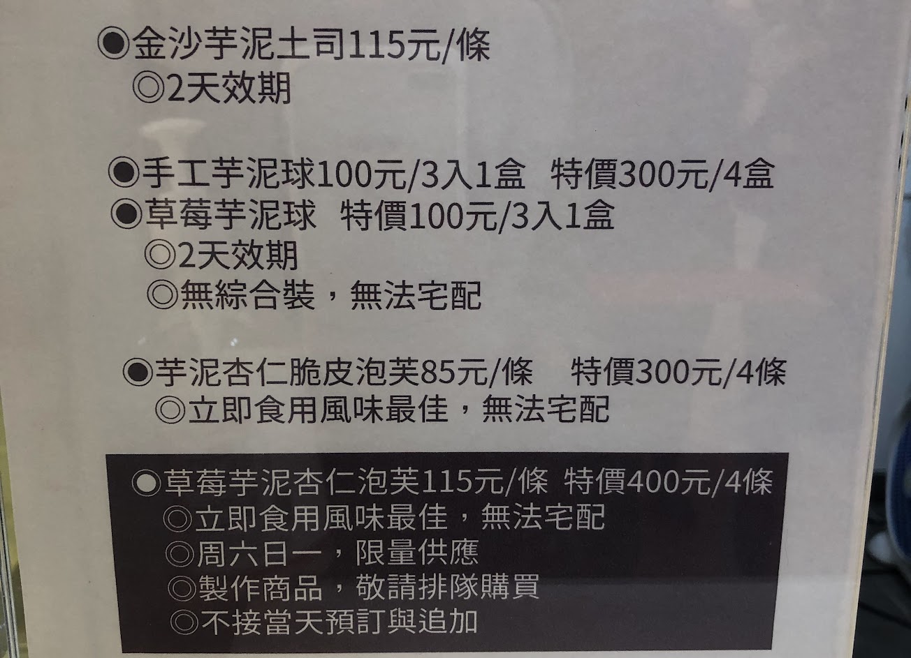 買了芋泥派、芋泥球,泡芙, 真材實料好吃到不行!價格都不貴!回購率100% …