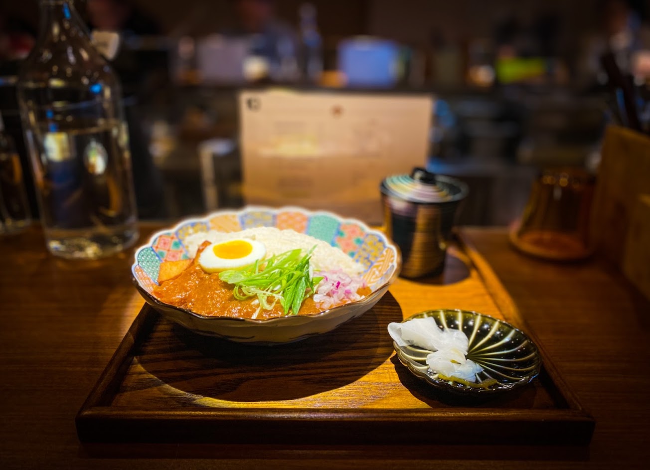 撲了好幾次空的咖哩飯店,終於吃到了,果然跟我想像的非常像,咖哩的口味非常的日式,隱約吃的到水果的酸味,也吃的到香料的辣味,屬於比較乾式的咖哩,配上生的洋蔥跟蒜苗真的是絕配,附的糖心蛋是炸過的,口感比水煮的好上一個層次。加點的天婦羅也是水準之上。果然厲害的店菜單上的品項都很少(只有雞肉,牛肉及綜合咖哩的選擇)。 裝潢很有氣氛,桌面打個spot light,就是要照咖哩飯叫你專心吃,大概唯一的小缺憾就是沒有冰水,不然就跟日本一樣了,哈