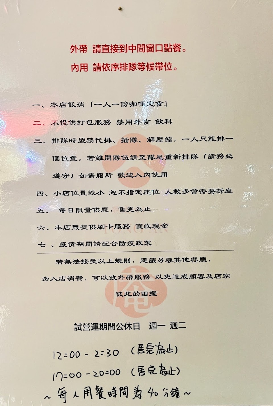 店外規則明明就寫人數到齊再排隊,我們排隊人先到齊,店員卻先給前面晚到齊的人安排位置,跟店員詢問後店員說只有這家店不用按照第一條規則,那請問為什麼不把這規則劃掉,當遵守的人是傻子嗎?