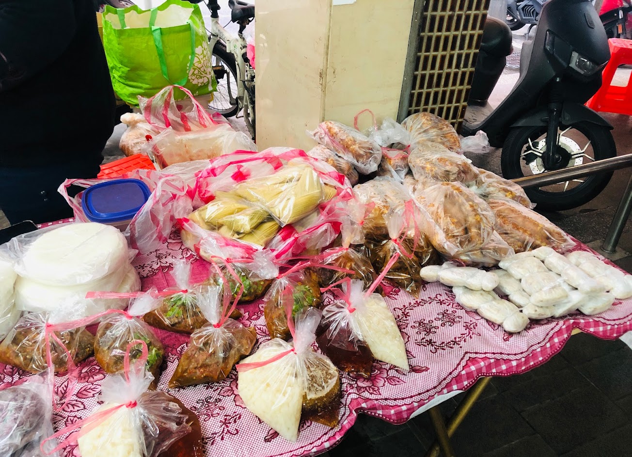 在門口的小吃販賣區買了米做的酸辣點心和香蕉做的甜蒸糕 🍌,口味特殊,建議一試!