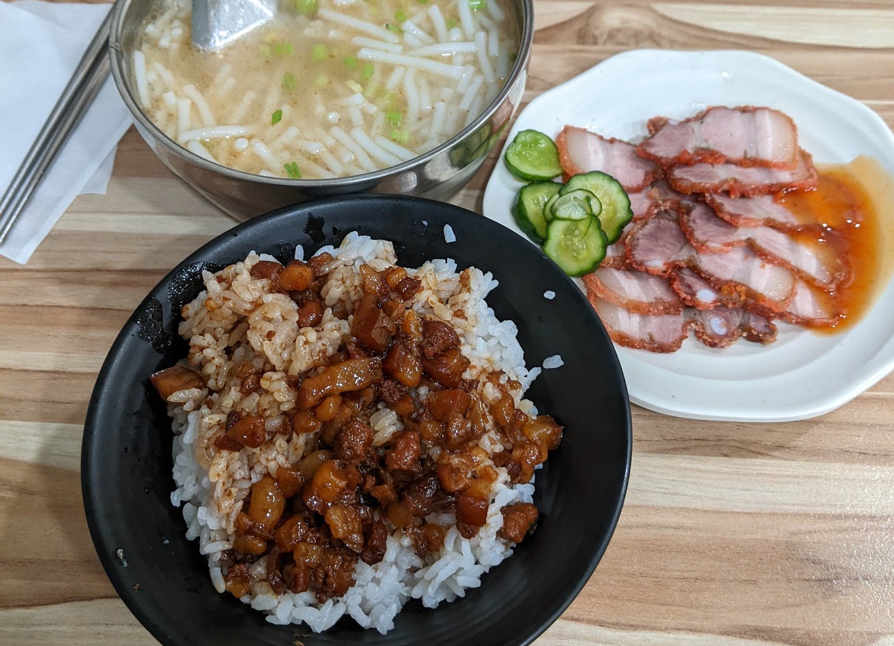 餐點味道都還不錯,小菜有附醃小黃瓜解膩讚讚。滷肉飯如果用好一點的米,會大加分。