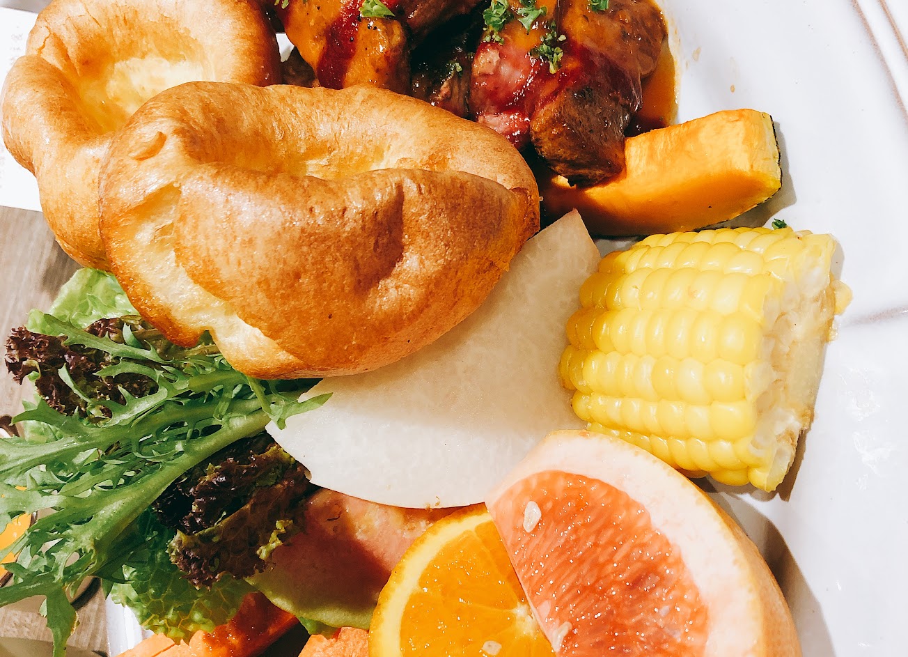 *?豬里肌肉切成條狀,剛煎好熱騰騰端上桌,香氣十足,建議小嘴巴女孩兒可以切小口吃,有兩個圓球狀麵包,店員告知是約克夏布丁麵包,是傳統的英式麵包,建議可以在麵包裡加些蛋、菜、肉 一口咬下真是滿足~