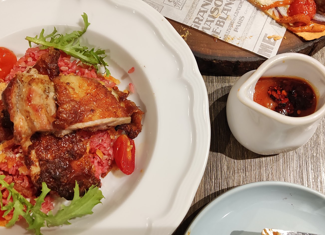 東西都不錯吃,苺栗冰沙真的有讓我驚艷到,酸酸甜甜的很適合夏天?牛肉烤餅也不錯,皮很脆,牛肉也蠻嫩的,整體味道稍微偏鹹,但是是好吃的!最後是雞腿花園燉飯,雞腿很大塊也很嫩,但飯我覺得沒有燉飯的感覺,中間會吃到脆脆的口感,旁邊的醬是辣醬+番茄醬(但吃不太出有辣?)總而言之餐點的部分還不錯!