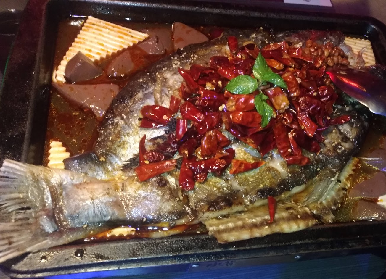 口味還可以,辣度夠,但就太鹹,點了個干鍋,與在四川吃的時候算接近了,但那排骨的鹹度太高了,有的90%是骨頭,沒肉。火鍋料煮在烤魚的湯汁中很有味道。