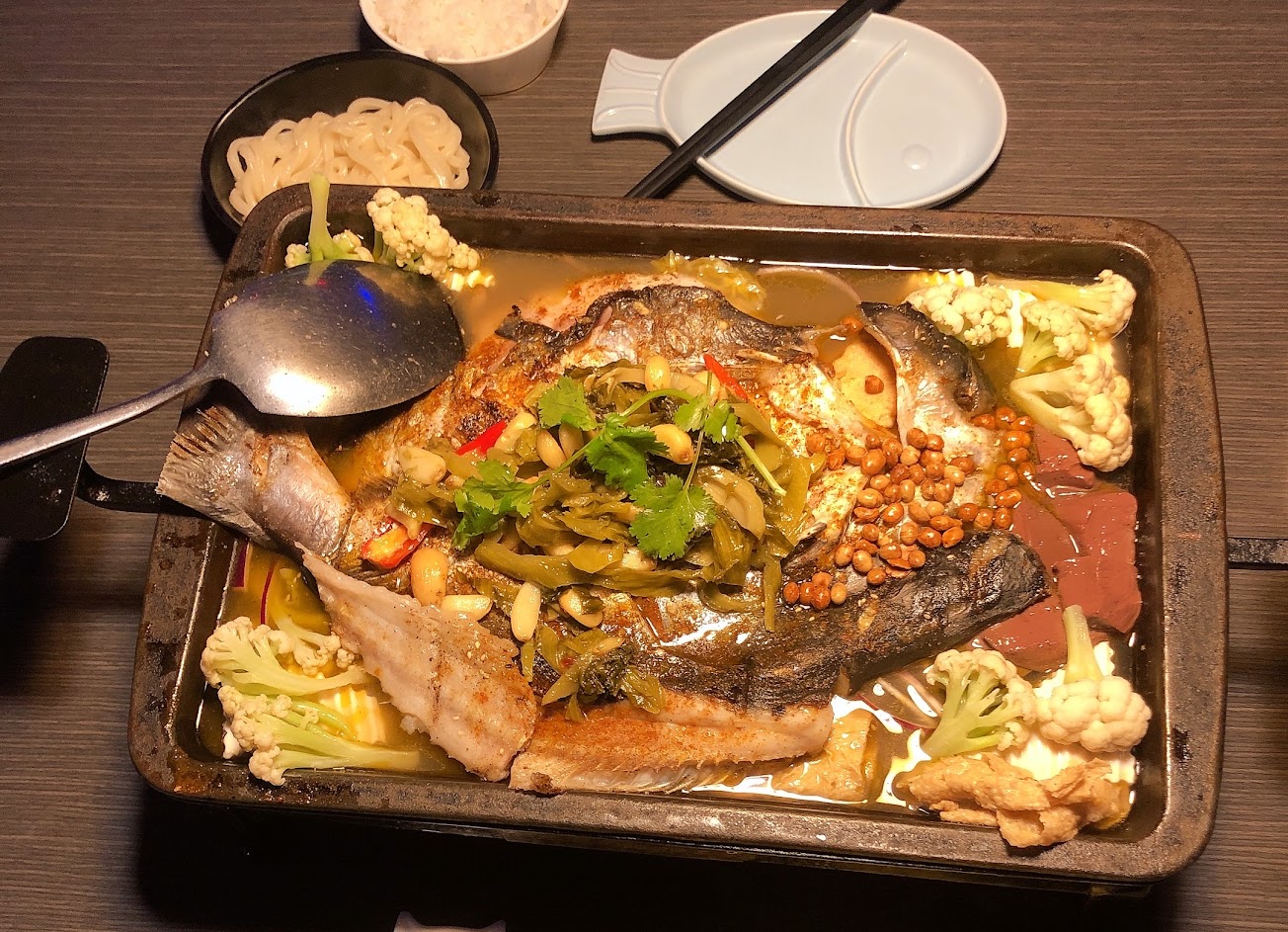 一次可以點2隻魚,2種口味,建議一個辣一個蒜味,豆皮,油條,大白菜鴨血都是一定要點,上桌建議煮5分,但是上面料要撥到湯一起煮,現在打卡還送甜點,記得帶個袋子,把包包衣服放裡面,吃完衣服不會有味道