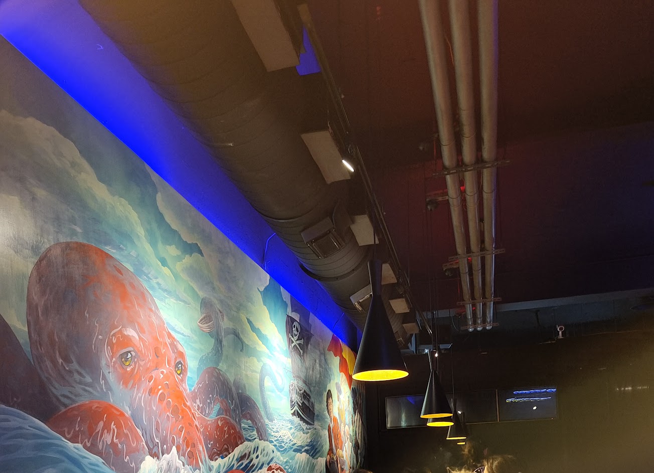 照明五彩繽紛且飾有壁畫的現代風餐廳,供應烤魚和其他海鮮特色菜。