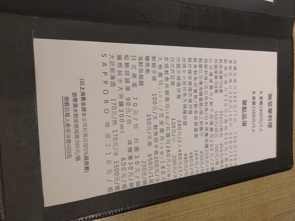 可能因為太忙碌了吧,從電話訂位時就感覺不太耐煩,到了現場,外場其實蠻熱心的,但可能因為太忙碌了,問我們是否套餐加價變定食,再三重複點餐後,還是東漏西漏;餐點吃完了主餐還沒有上,反應後發現隔壁桌也是一樣狀況(同樣主菜),爾後所上來的八貫握壽司真的令我傻眼,真的只能想,可能是因為太忙了,師傅來不及捏,說真的,外面一盤三十元的壽司也不至捏成這樣,這樣的出菜讓人感覺蠻不好的。