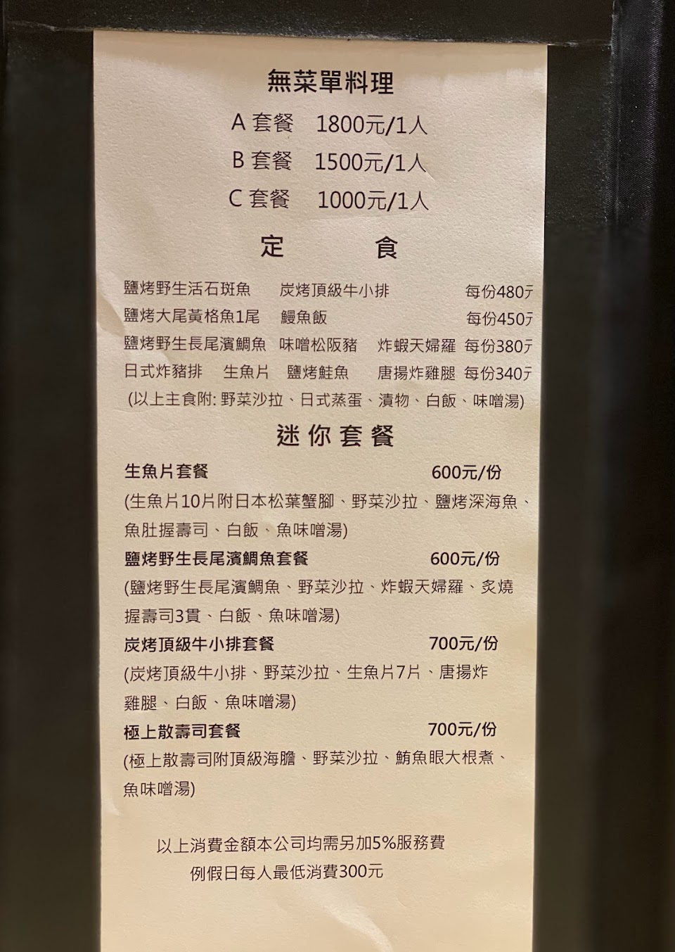 不得不說,能開這麼久不是沒有原因 服務 內用 餐點類型 晚餐 平均每人消費金額 $800-1,000 餐點:5 服務:5 氣氛:5 建議的餐點 鮭魚生魚片, 生魚片套餐