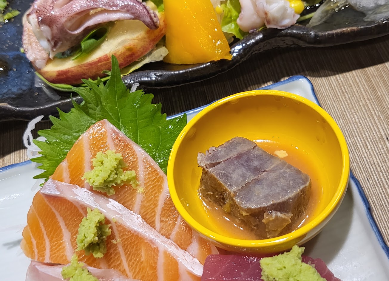 例如:芥末是現磨的,建議不要拌進醬油,可以夾一點放在生魚片上再沾醬油