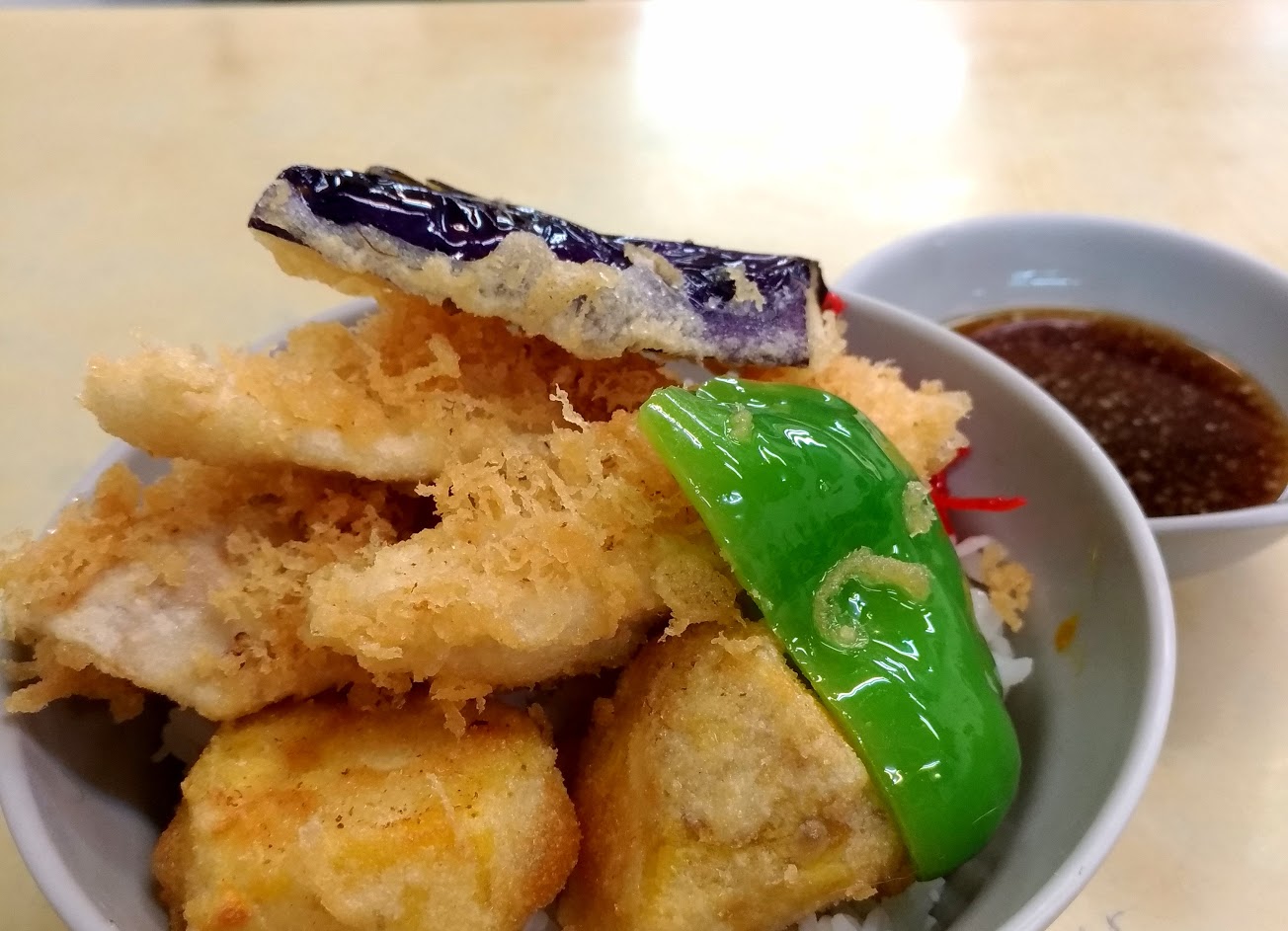 照片是90元炸魚飯,附一碗味增湯、沾醬。麵衣炸起來相當乾爽,乾爽到如果沒有湯和醬,吃起來會像是柴魚飯。最經典的是,配菜選用地瓜去炸,我吃到最後只得直接浸泡醬汁,才會入~味!