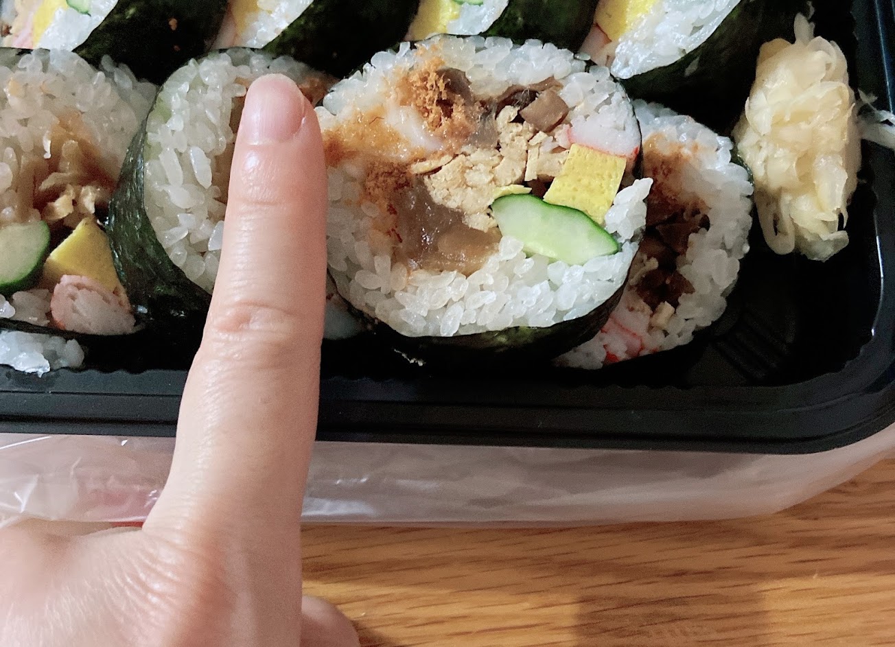 外帶海苔壽司 很厚很紮實用料實在 比外面貴一些 但是比外面的大顆 料也新鮮飯也很軟Q 好吃