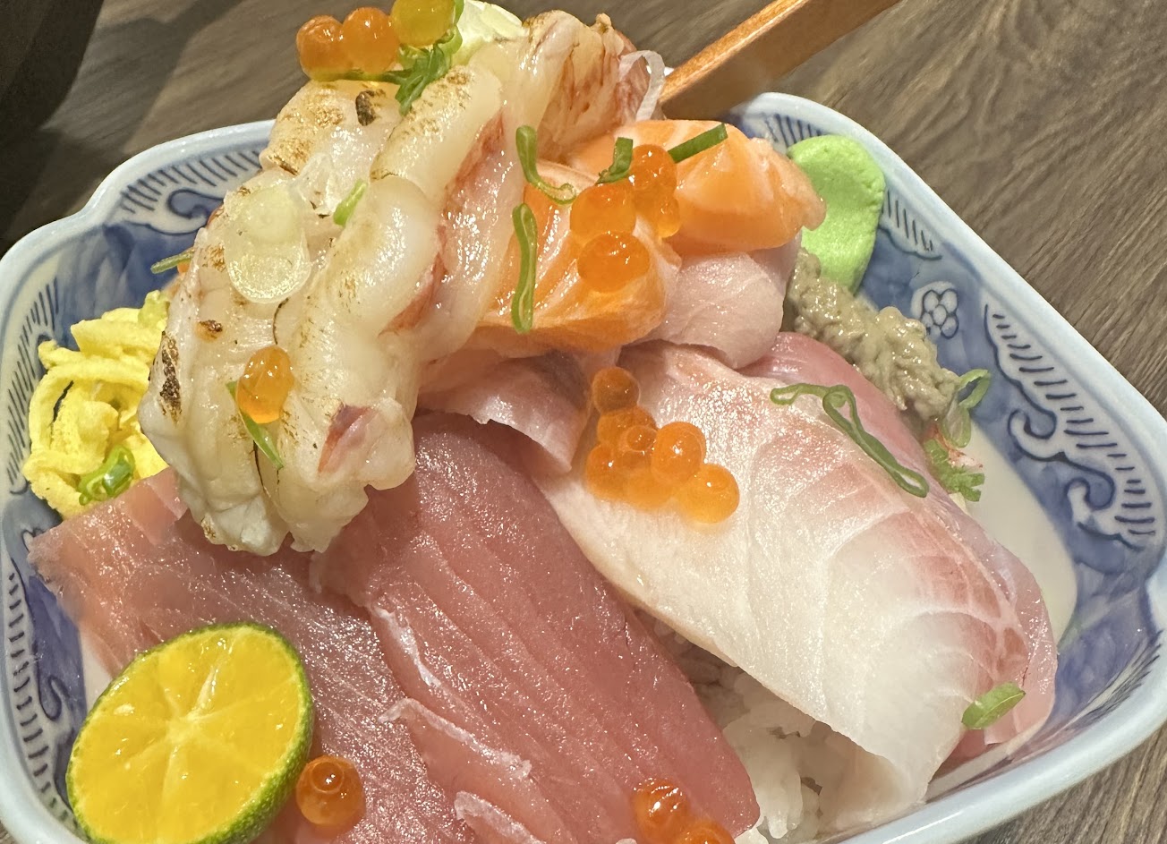 點了生魚丼,份量一般,新鮮度還可以,但當天鮪魚的部分切得不好,吃起來口感偏軟爛,生魚上的魚皮及一些邊角的部位沒修乾淨, 增添了腥味;炸牡蠣中規中矩但沒有太多驚奇、烤豬肉串偏硬,整理來說水準最好的是午仔魚一夜干。