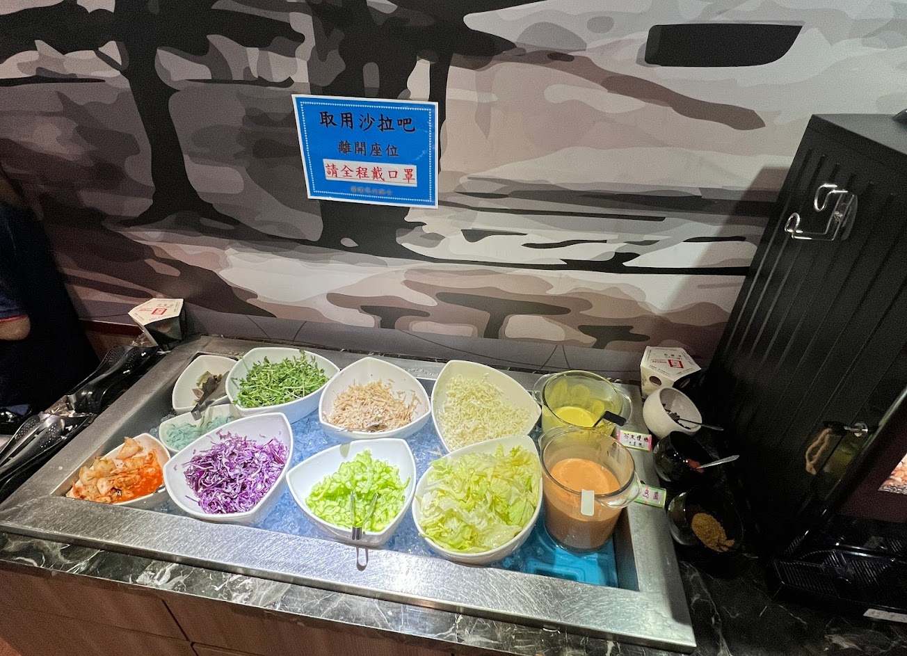 Salad bar、水果新鮮、配餐種類豐富、服務人員態度很好,有耐心❤️。麵條Q,豬排OK.