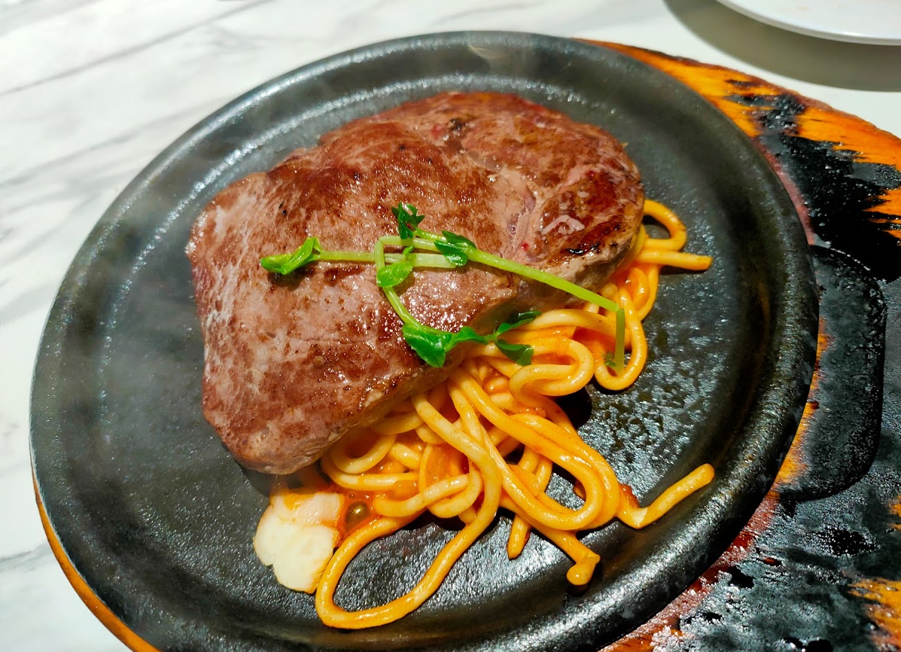 雞腿排比牛排大。 鐵板麵還有加麵的服務。