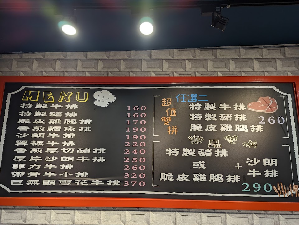 脆皮雞腿排真的很好吃,不過要注意可能偶爾會焦;豬排都有醃過,也蠻香的;如果要點牛,最推翼板牛,軟嫩多汁,但份量會少一點。總之,餐點都會不錯,現在一個月都會來兩、三次。