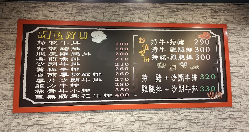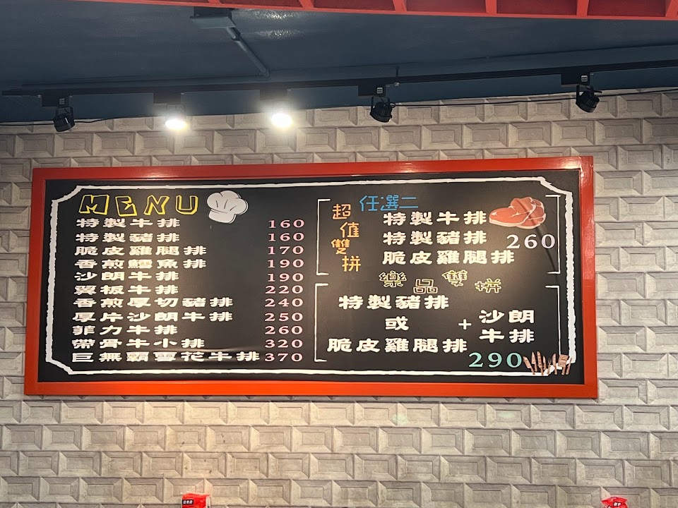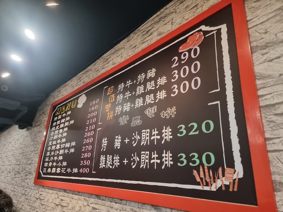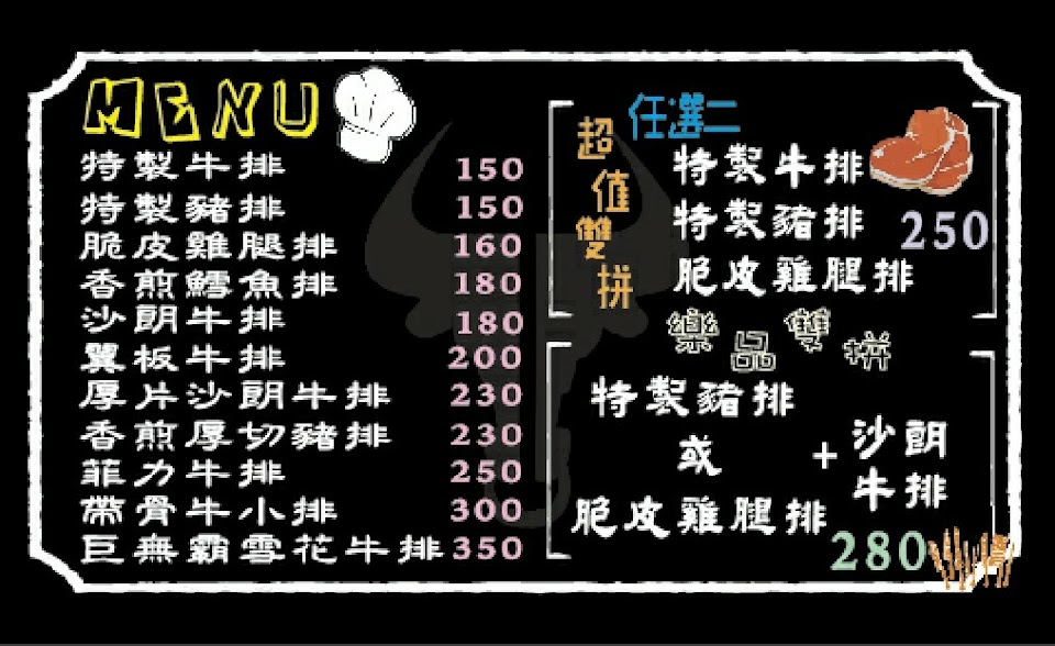 雙拼 特製牛排, 沙朗 雞腿排, 酥皮濃湯, 鐵板麵, 超值雙拼特豬 雞腿排, 脆皮雞腿排