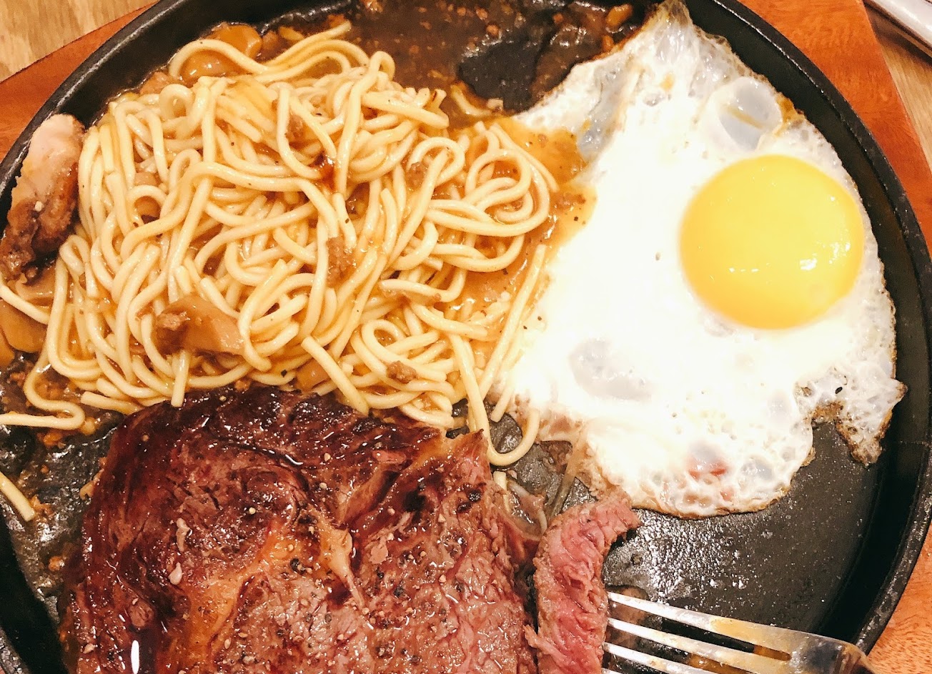 沙朗牛排帶點筋算是有嚼勁,雞腿排非常嫩,玉米濃湯料很多(馬鈴薯、玉米、火腿),出餐前經過火烤加熱的鐵盤讓蛋跟麵的熟度剛剛好。