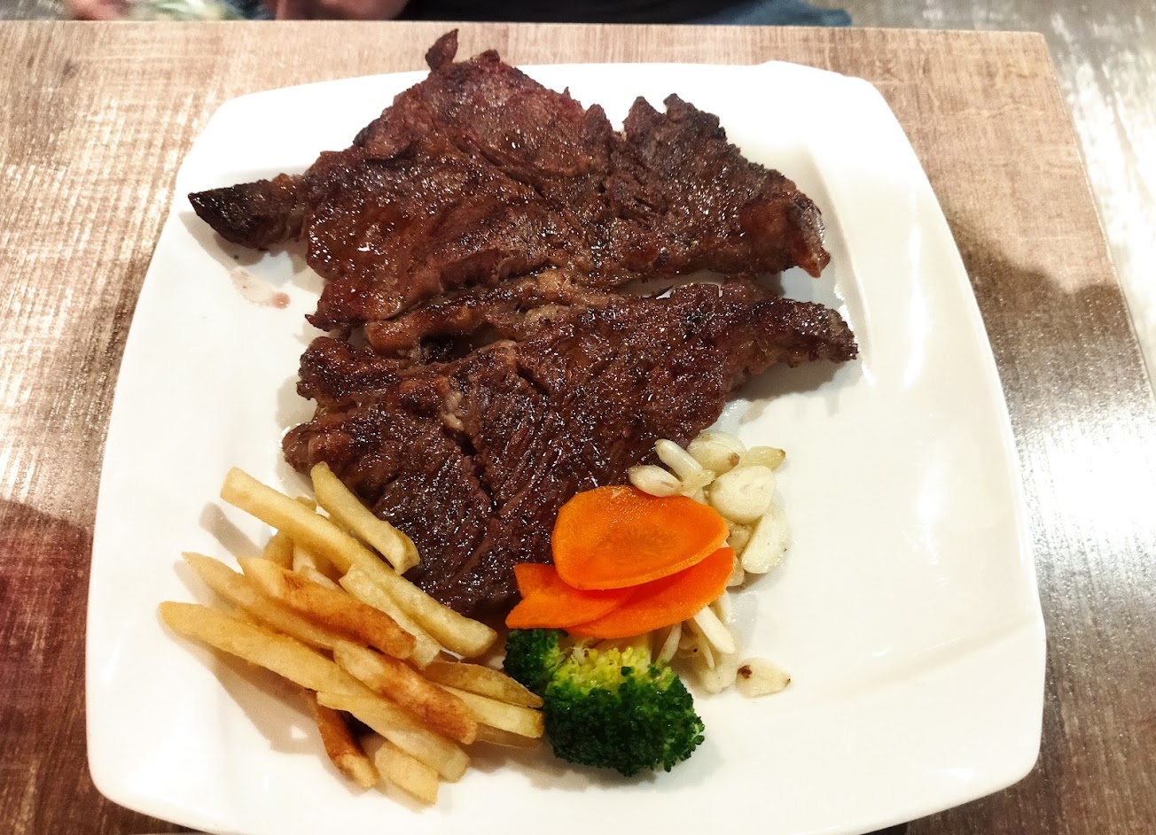 牛排有點筋是正常現象,但是這家菜單上的翼板牛排、肋眼讓人非常難咀嚼,肉的韌度根本就是在吃橡皮,同樣價格孫東寶還做得比較好咬。評論4.1顆星,不知道是中和人不懂牛排還是評論洗得厲害。如果要吃5、6百元的牛排在中和絕對有更好的店 不清楚現在肉的品質是否有改善,但是為了自己的牙齒與下顎的健康,暫時不會再光顧