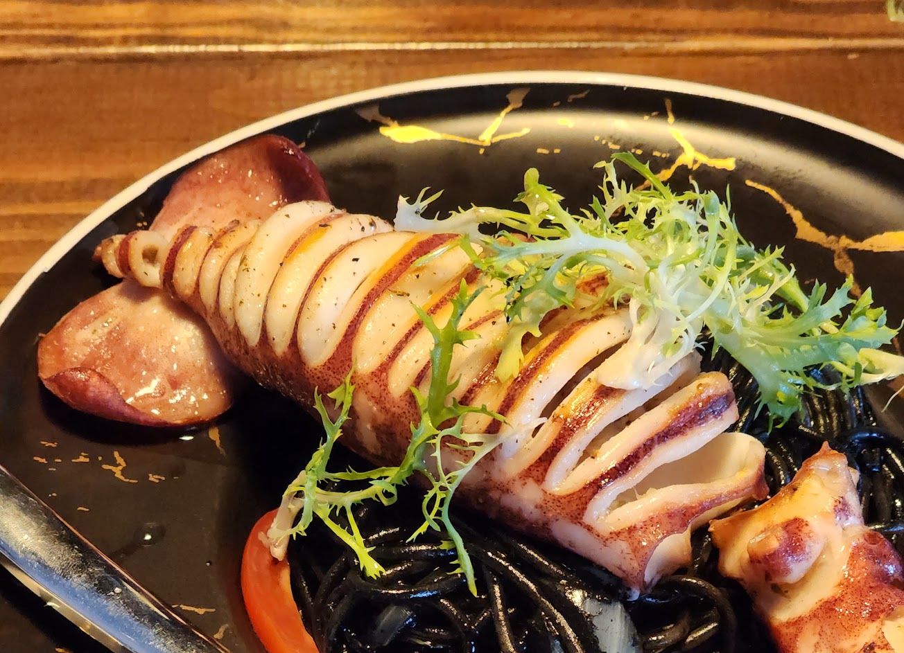 空間舒服,下午一點多來沒什麼人,蜜瓜火腿沙拉很棒,墨魚麵墨汁醬非常有誠意,但透抽有很重的土味扣分