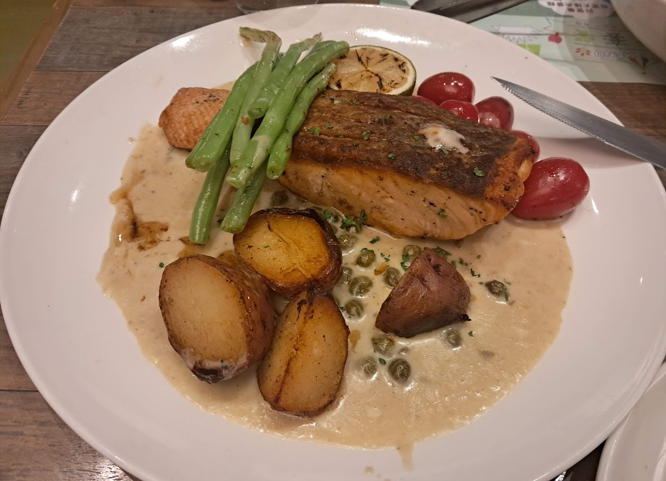 晚上八點用餐,開胃菜的松露薯條反而比披薩跟主餐更晚上桌,瑪格麗特披薩很好吃,盤中還有幾顆番茄,服務人員似乎沒有留意到,很快速就被收走了,主餐的部分就普普通通不另外闡述