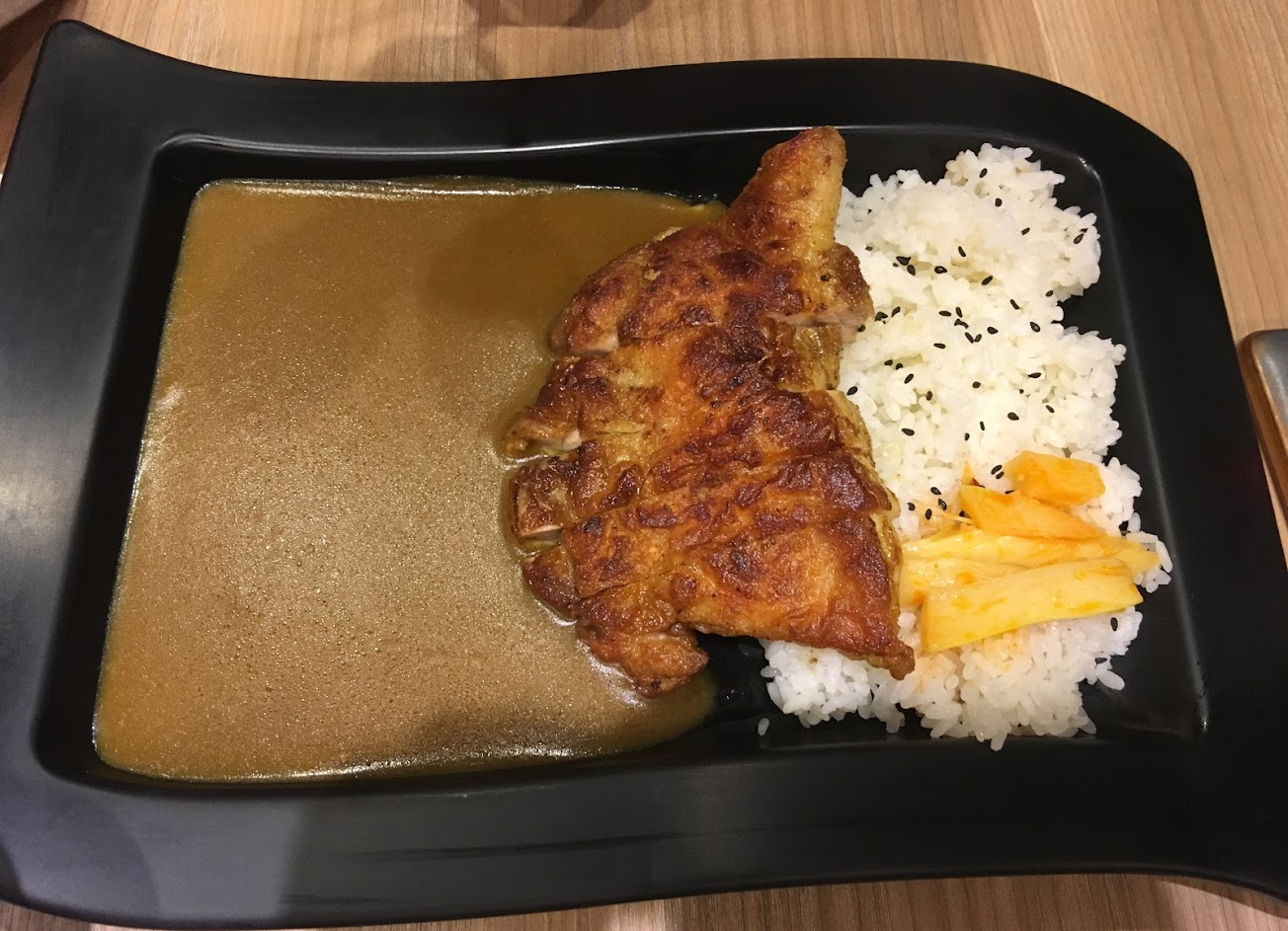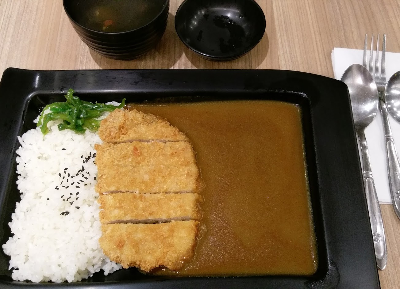 用餐空間不大,價格中等,咖哩醬沒有添加任何東西,味道偏酸,個人沒有很喜歡>< 不過蠻濃郁的,可以自由調整辣度。豬排有點乾,雞腿好吃,湯很好喝,湯飯都可以無限續,服務親切,不收服務費,人多時需要等一下。