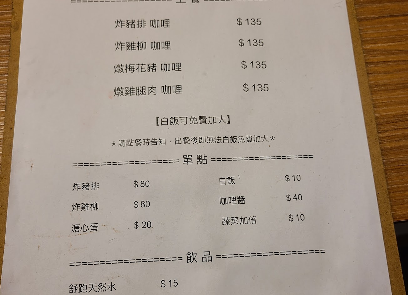 菜單,咖哩飯都是135,有炸豬排雞柳、燉雞腿肉跟梅花豬,也有配菜可以加點,咖