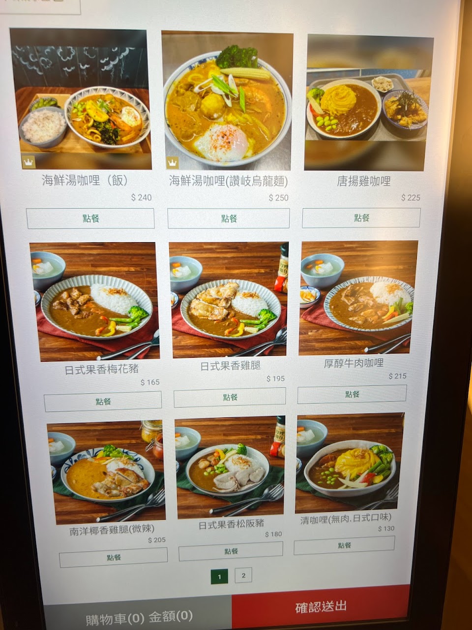 偏臺式口味的咖哩專賣店,內用空間稍小,但也不致過於擁擠,店員服務態度非常不錯,環境也很乾淨。點餐時,可使用店門口的自助點餐機,除了點餐外,還可以直接先付款,接受信用卡、行動支付(悠遊卡、iCASH、apple pay、google pay、samsung pay、LINE pay、街口支付)及現金,非常方便。每道餐點會依顧客的選擇,客製化製作,除了一定會附上的現煮湯之外,亦可以加價多選水波蛋或旋轉歐姆蛋,飯量及配菜也能選擇。咖哩醬則有兩種口味,各有特色,首訪建議可以點雙醬(日式咖哩跟小辣的果香南洋咖哩),兩種口味一次滿足。各種食材也都非常新鮮,料理的口味也不會太重。