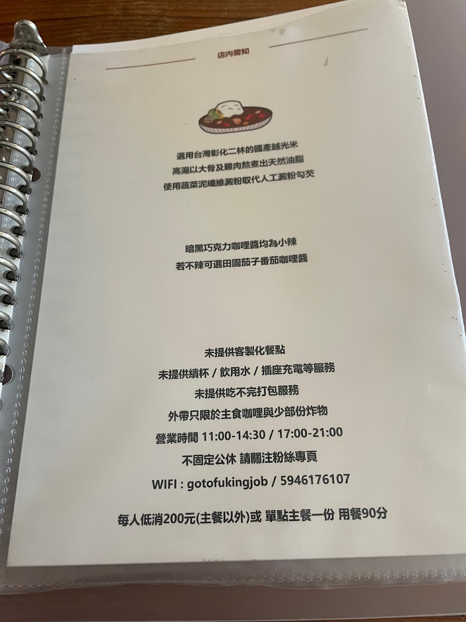 咖喱好吃,加蛋很加分,肉也還蠻嫩,飯稍微硬一點,沒有附水,那天假日去,不過沒什麼客人,包場了,書法招牌很有感覺,新菜單如附圖