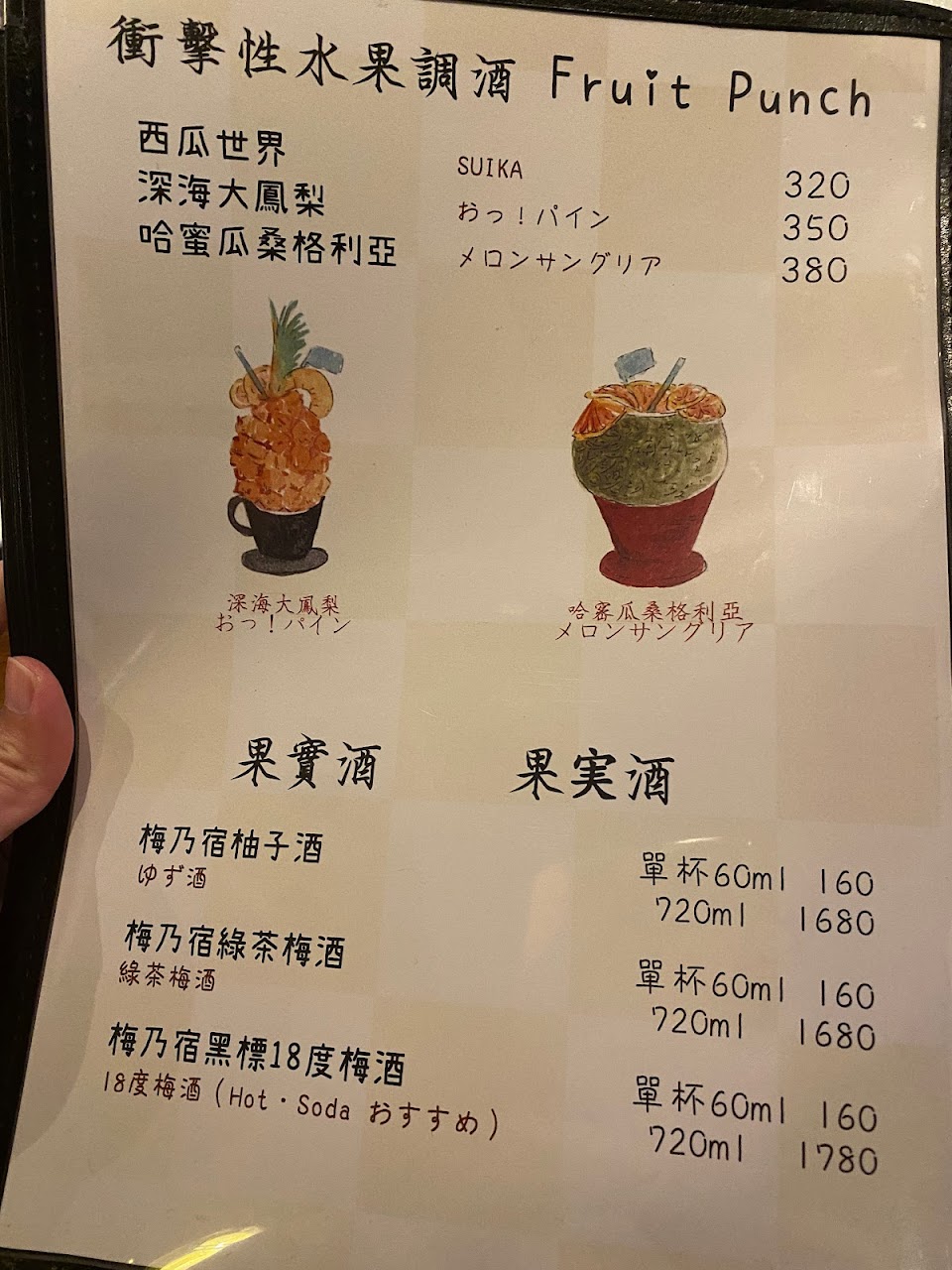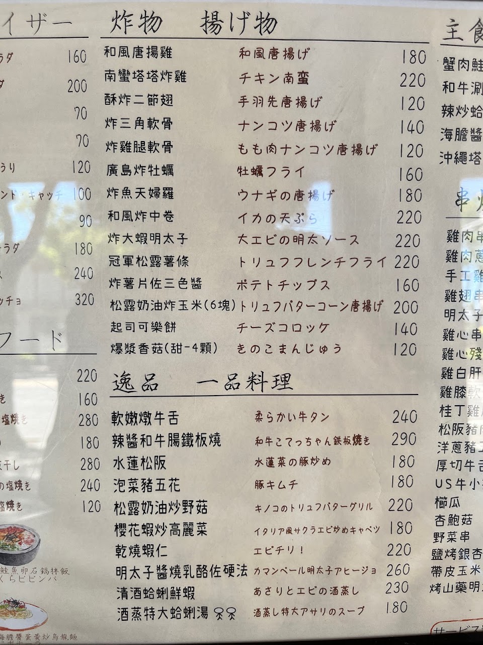 松阪豬炒水蓮, 一夜干 午仔, 明太子醬燒乳酪佐硬法, 松露奶油炸玉米, 和牛涮涮烏龍湯麵, 南蠻塔塔炸雞, 冠軍松露薯條, 炸魚, 烤中卷, 烤牛舌 左, 蔥雞肉串, 烤牛肉串, 豬肉串, 冠軍薯條, 烤午仔魚, 炸蚵仔, 炸廣島牡蠣