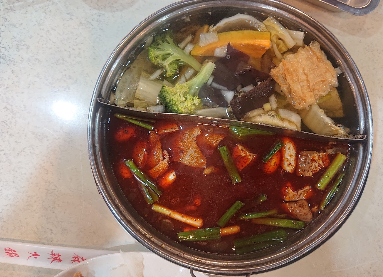 一鍋中隔分 麻辣 一般 2種,取菜自助(疫情期間有張貼提醒需戴口罩取,惟有些消費者視若無睹,也未見餐廳業者勸導)菜色約20左右樣式,蔬菜內(含 香菇 木耳 豆腐類 ……)少量海鮮類, 2樣 牛豬肉片,皆為一般性(非高檔),自助式盛菜盤多佔空間,小桌更顯得不方便。綜合論顯得一般般,但網路上頗為熱門。