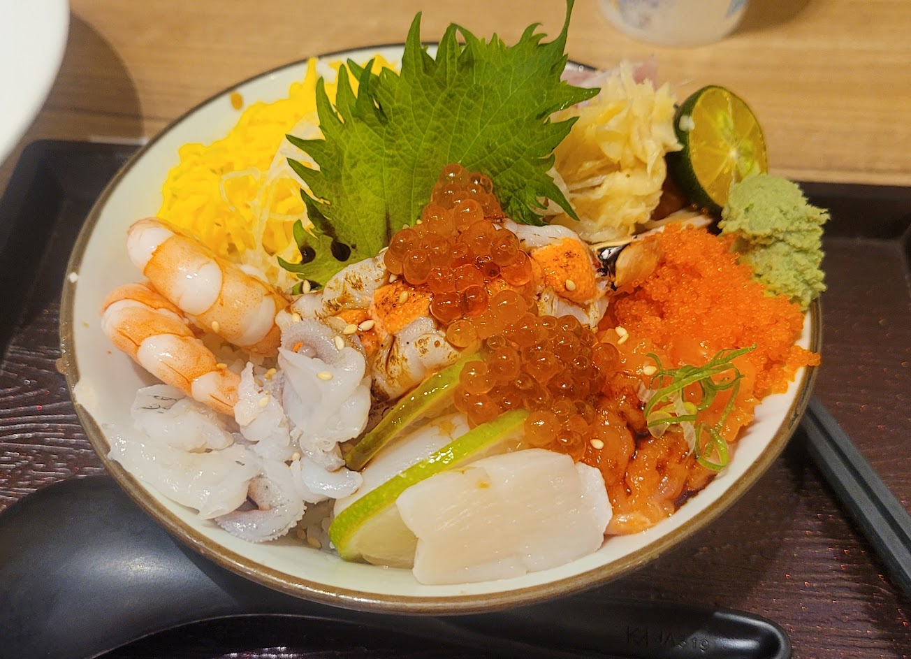 今日餐點為大盛海鮮丼飯與東京最強海鮮丼飯,個人覺得在板橋來說價格偏高,用料實在好吃,東京海鮮丼飯中有干貝、鮮蝦兩隻、生蝦烤美乃滋、蝦卵與魚肉塊,醋飯酸的恰好,但芥末給的有點偏多。整體表現值得來訪。