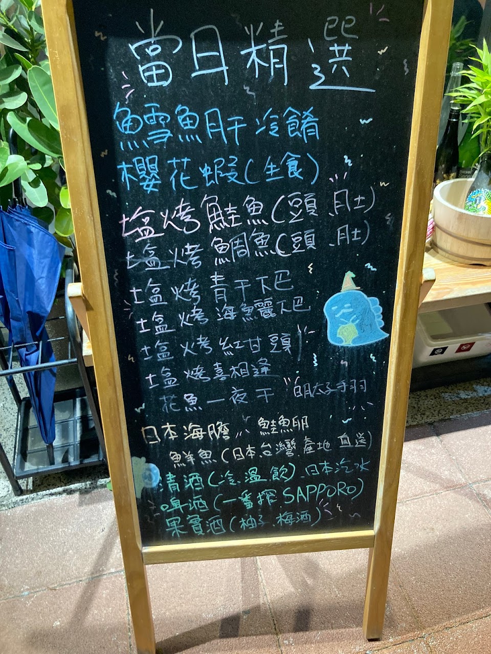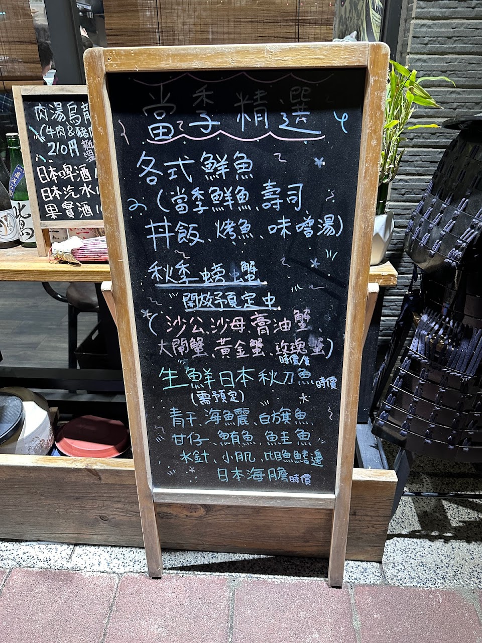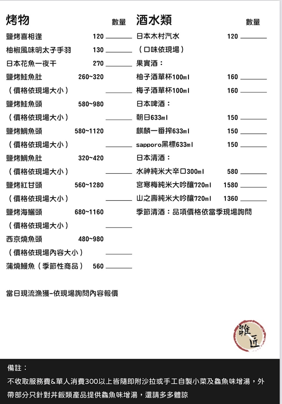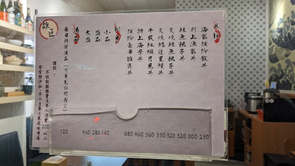 雛匠菜色提供主要是以生魚片、丼飯、握壽司,以及各式烤物為主,烤物為季節性食材,會寫在小黑板上,有什麼想吃的都可以直接跟老闆點菜詢問客製,店內也有提供無酒精、有酒精的各種飲品。