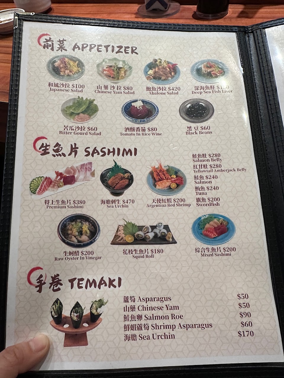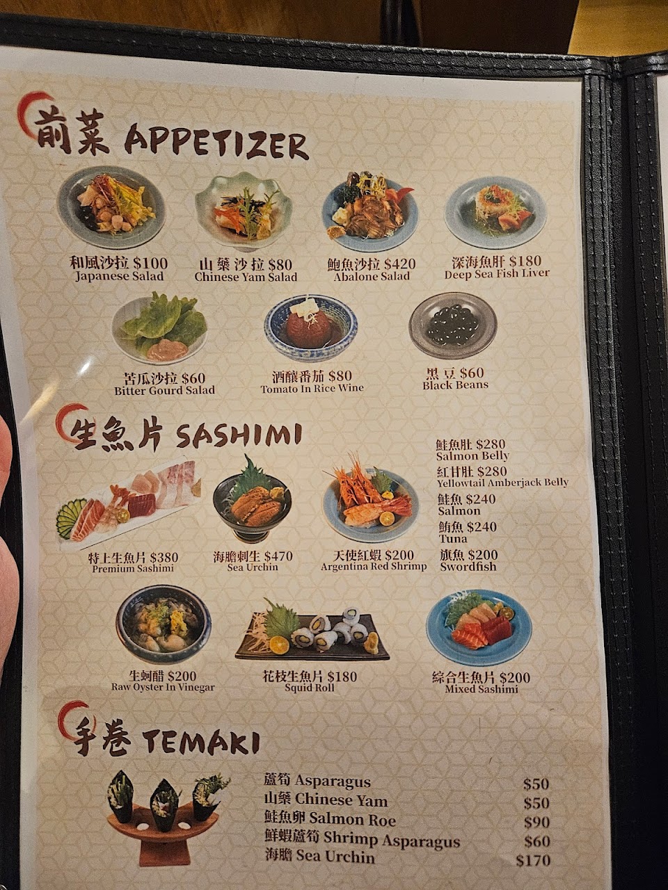 套餐有分600,800,1000,這次點了1000元的,生蚵醋,新鮮ㄟ,讚。生魚片沙拉,第一次看到,生魚片新鮮入口,鮑魚也好吃。比目魚,炙燒鮭魚,蝦蘆筍壽司。酪梨跟鮭魚花壽司,一般但很飽。文蛤蒸蛋有蛤仔,蝦,一起蒸煮後蛤和蝦還是蠻好吃,蒸蛋很嫩很甜,好好吃。午魚一夜干,乾甜好吃。玉米筍跟豬肉捲,玉米筍烤起來再撒點細鹽鹹甜好吃,豬肉捲很順口。松阪豬肉…好撐…好讚…有吃飽嗎?是開玩笑的吧…(因為是三個人都點1000元套餐,所以可以看到三份壽司,午夜魚,松阪豬,蒸鮭魚頭則是煮一份三個人共享),還不錯。最後是味噌湯,感覺就是一般味噌湯,但好好喝。為何是最後才送?老闆說是依照日本習慣.
