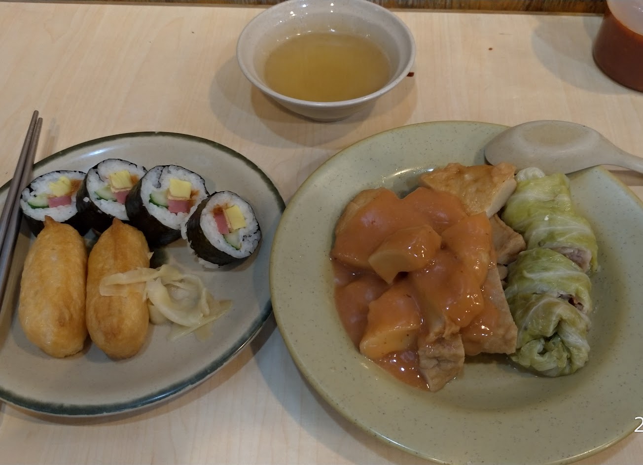高麗菜捲包的肉非常不紮實,吃起來很難吃。壽司醋飯非常硬,不會再來