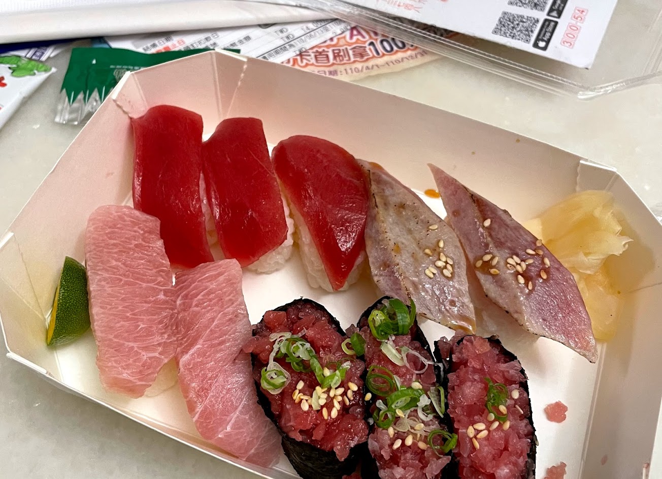我們是買鮪盛合舞鶴(有各種不同的鮪魚壽司口味)與炙燒鮪魚,可惜不知道為什麼炙燒鮪魚吃起來會有一點點腥,但在綜合鮪魚壽司中的鮪魚就不會腥。(品質有一點點不平均)