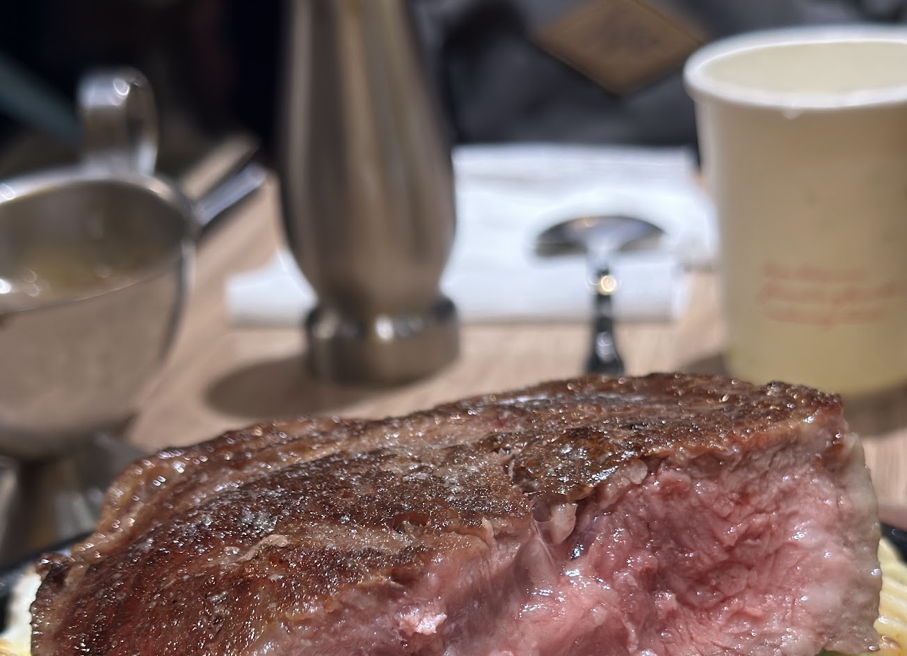 點了最便宜的莎朗五分熟260元,牛味偏重,肉偏扎實,不會到咬不動,但也沒軟嫩,算大塊,吃了會飽。