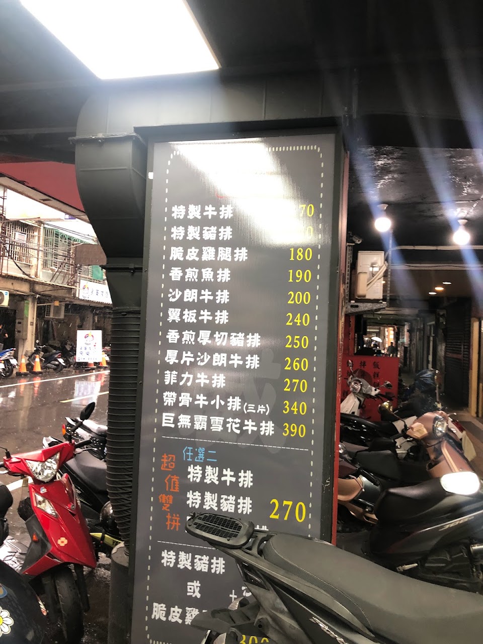 價位不高但美味的牛排店。每份主餐(牛肉、豬肉及雞肉)的肉質都相當不錯,且都有附一碗酥皮濃湯。特別推薦香煎雞腿排,酥脆的外皮及刀子切下去後流出來的肉汁都讓人回味再三。豬排也與常見的平價夜市豬排完全不同,雖然稍微有點乾,但沾滿蘑菇和黑胡椒汁也算相當不錯。主餐也提供超值雙拼,雞豬、雞牛和牛豬雙拼都只要270元(@2023/10/21),能一次吃到兩種不同的肉,滿滿的肉讓人又飽又滿足。另外,店內還有飲料和冰淇淋可以無限取用,是間高CP值的店。