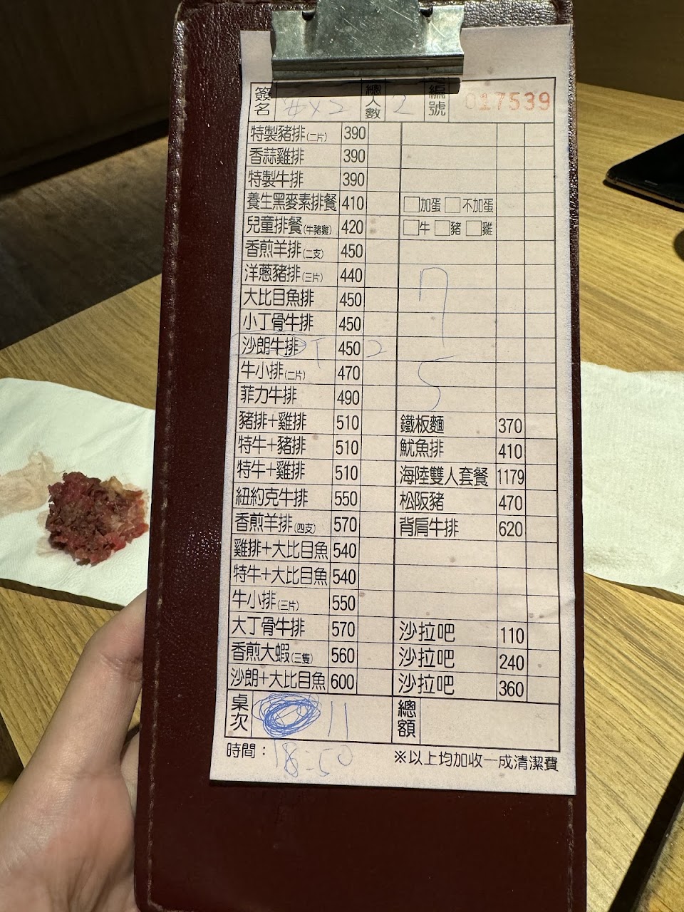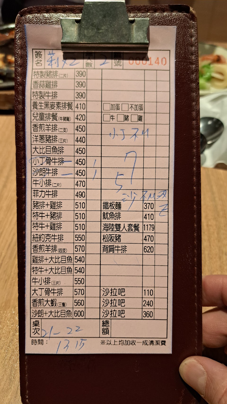 地板、桌子黏黏油油的廁所就不用說了,餐盤、杯子、餐具都洗得不乾淨,自助吧非常粗糙、敷衍,服務人員收盤子的速度慢,排餐肉質非常差建議去附近的夜市吃夜市牛排體驗會比較好(有兩間),很想問這間店的老闆環境清潔和餐具清潔那麼爛到底是怎麼好意思收10%清潔費?