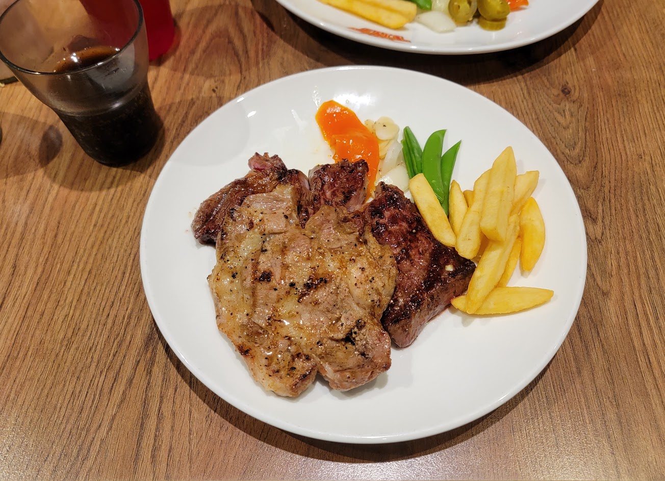 平價牛排的價格卻有餐廳的等級,不同於台式鐵板牛排而是用白瓷盤裝盤,牛排、豬排入口便瀰漫炭烤香氣,因個人不愛帶血水5分熟故選擇7分熟,但牛肉依然軟嫩,在平價牛排中算是很令人驚艷。兒童餐的豬排也不馬虎,同樣香氣十足。配菜的洋蔥和蒜片建議可以再熟一點較不嗆口。
