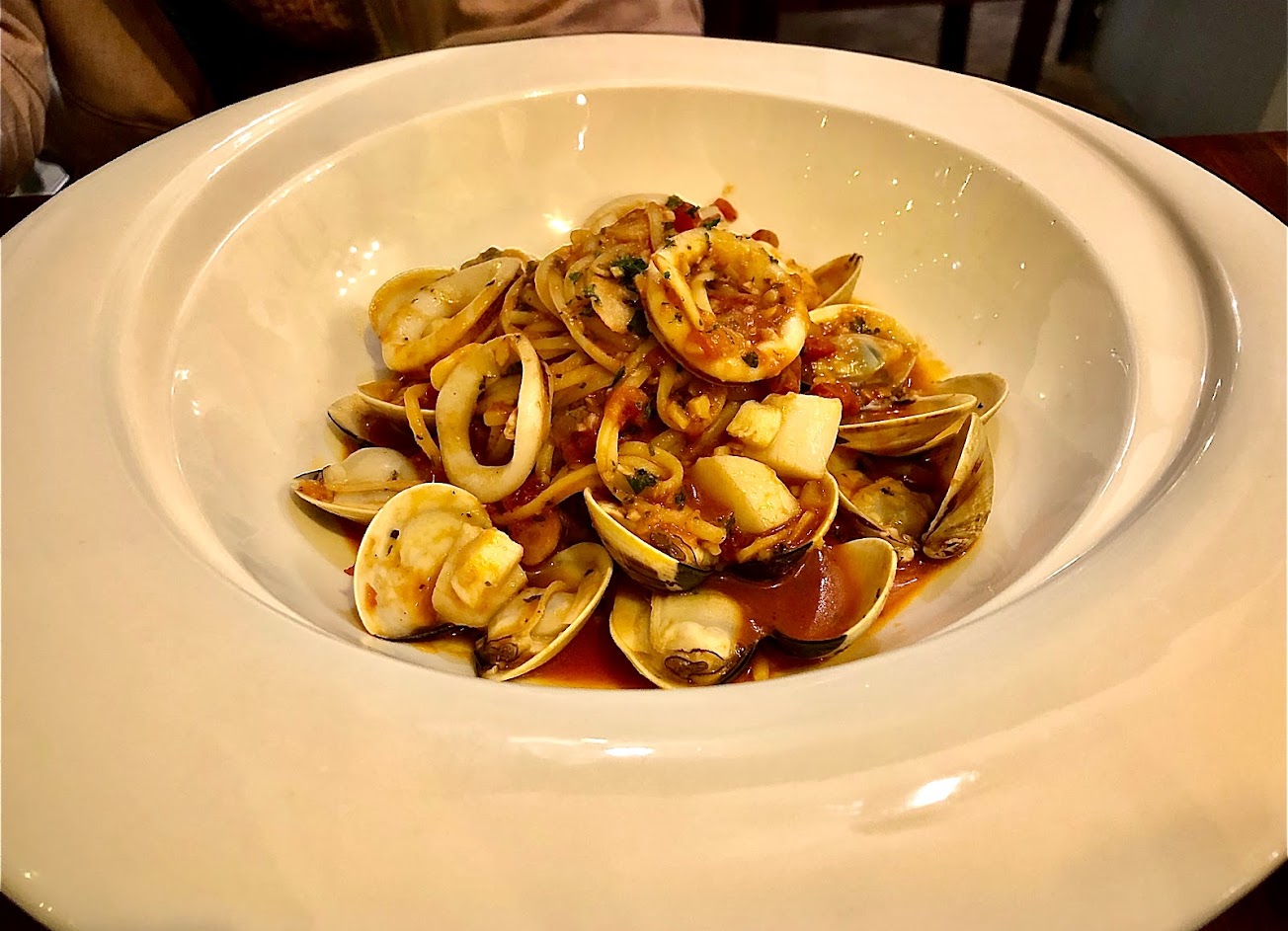 今天終於第一次來訪,首先登場的是烤的酥又富有彈性的麵包,一口咬下去恰到好處的口感,隨著湧上來的麥香,讓人更期待接下來的餐點。接著前菜,蒜香白酒蛤蜊登場,每個蛤蜊都像蛤蜊屆中的巨巨。煮蛤蜊的湯有著恰到好處又不會太搶味的淡淡香草味,不會像日常生活中搭配九層塔煮的蛤蠣湯,反而更能襯出鮮甜的味道。