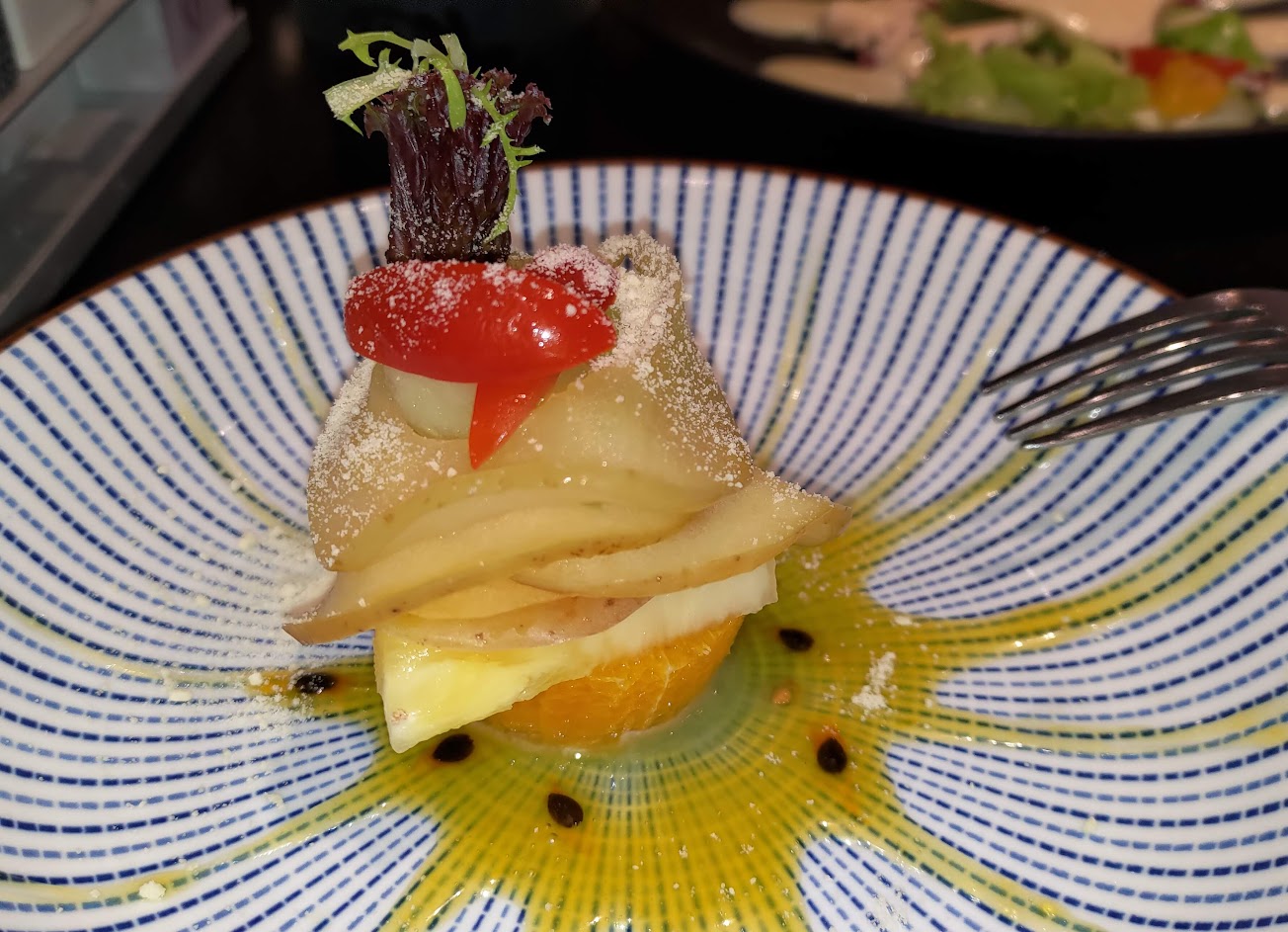 調味上主要的菜都還不錯,但是主菜搭配的那個地瓜…真是吃過的地瓜裡最難吃的,沒有之一;超級乾硬,也沒有地瓜香氣。