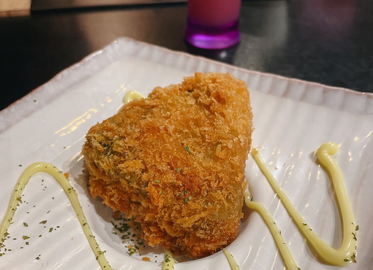 黃芥末作為佐料擠在盤子上,炸飯糰酥脆的外皮和薑黃飯的香搭配在一起,讓人不經想再來一顆,和起司牛肉炊飯相比明顯更為好吃。